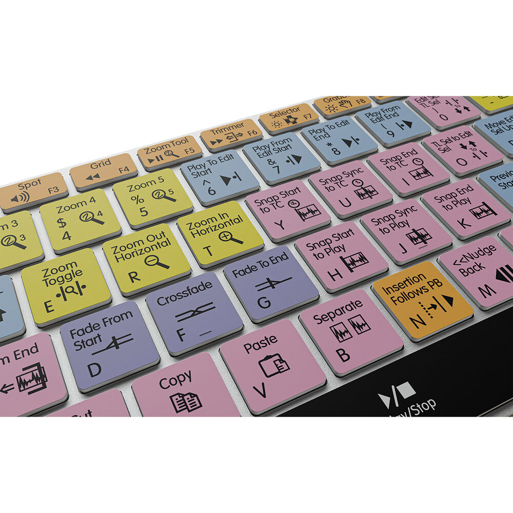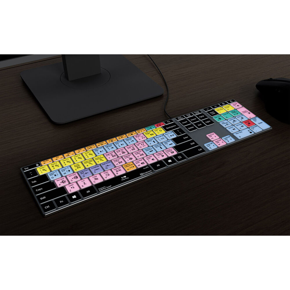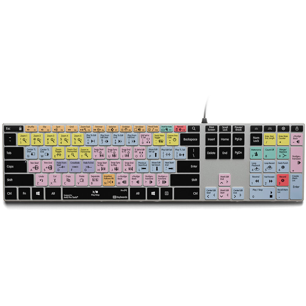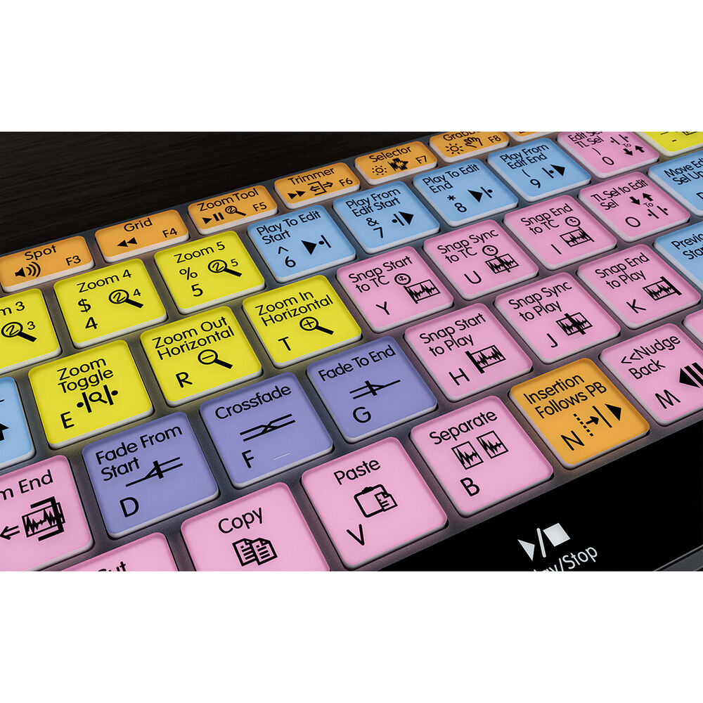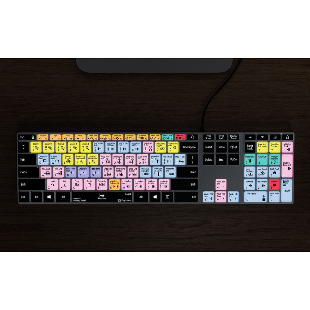 This Windows Pro Tools Keyboard from Keyboard Covers is fully backlit so you can work all through the night or reduce eye strain in a dimly lit edit room. A backlit keyboard is the ultimate way to accelerate your workflow and greatly enhance your editing. This keyboard features numerous shortcuts and cleverly color groups them so that you can find similar tools faster. Each key features the shortcut icon, shortcut text, and the keyboards standard typing letters for regular typing.