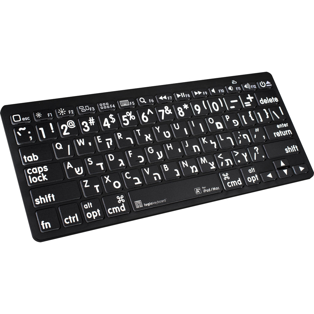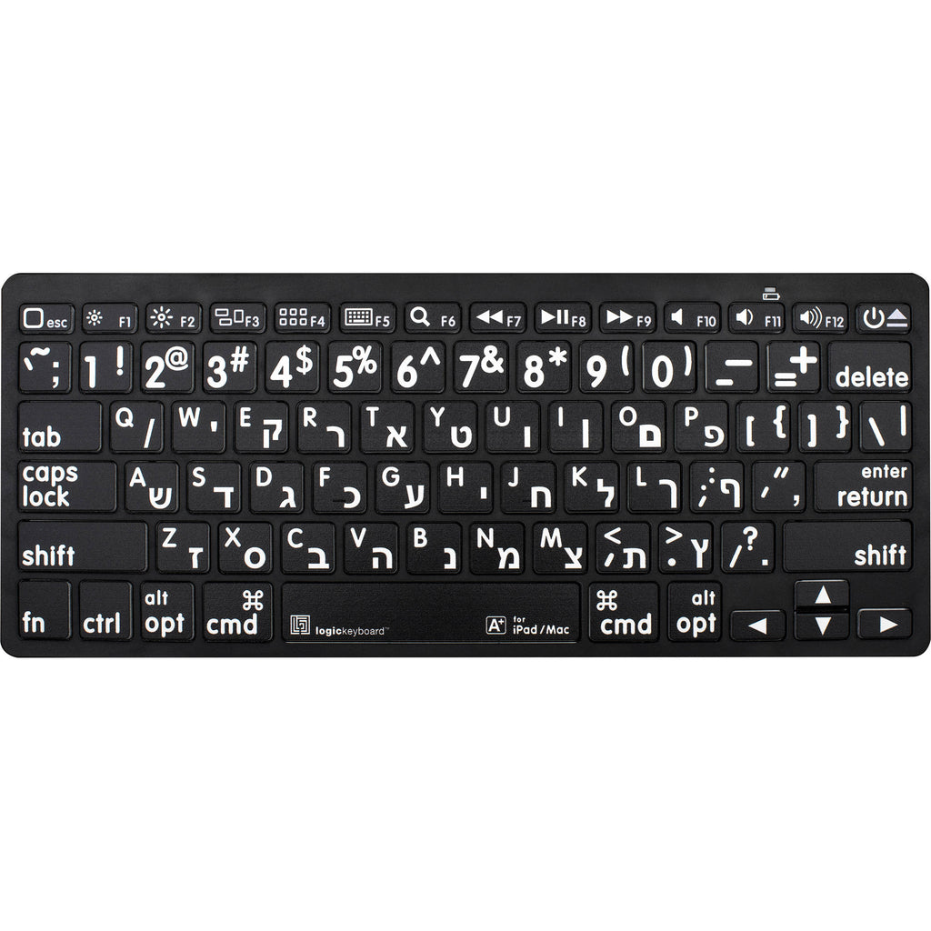 The white on black XL Print Bluetooth 3.0 Mini Keyboard from LogicKeyboard is designed for the vision impaired and mature aged Apple iPad, iPhone, and iPod users. It provides a way to type on a keyboard with letters that are easy to see and locate. The mini keyboard uses Bluetooth 3.0 technology for connecting to any Bluetooth compatible device. This keyboard features function keys to work with Apple iOS. In addition, the keyboard supports both American English and Hebrew languages.