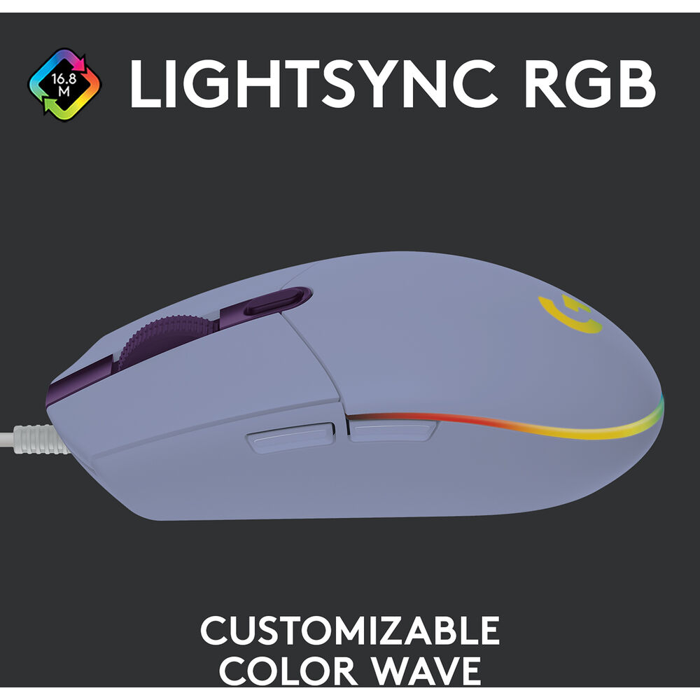 Get custom color and gaming-optimized performance with the lilac G203 Lightsync Mouse from Logitech. Designed for comfort and performance, this gaming mouse features six programmable buttons and a resolution of 200 to 8000 dpi. Furthermore, the Logitech Lightsync RGB lighting provides easy customization and 16.8 million colors, as well as audio visualization. Users can sync the G203 with other Logitech gear for uniform look. Boasting a 32-bit ARM microprocessor, a 1000 Hz polling rate, and 1 ms response time, this mouse also uses a 16 bits-per-axis data format. The G203 uses requires a free USB port and its cable measures 6.89'. This mouse is compatible with Windows 7 and later, macOS 10.10 and later, and Chrome OS.