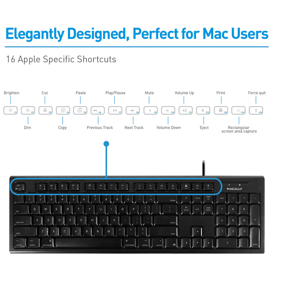 The black 104 Key Full-Size USB Keyboard for Mac from Macally is a wired USB keyboard featuring 104 full size and thin keys for a comfortable typing experience. There are 16 shortcut keys for launching Mac OS X applications at the touch of a finger and LED indicators for caps lock and "Fn" key lock. Simply plug the keyboard into a USB Type-A port on your computer and you can start using it right away. Additionally, the keyboard has a slim profile that allows it to store easily when you're not using it.