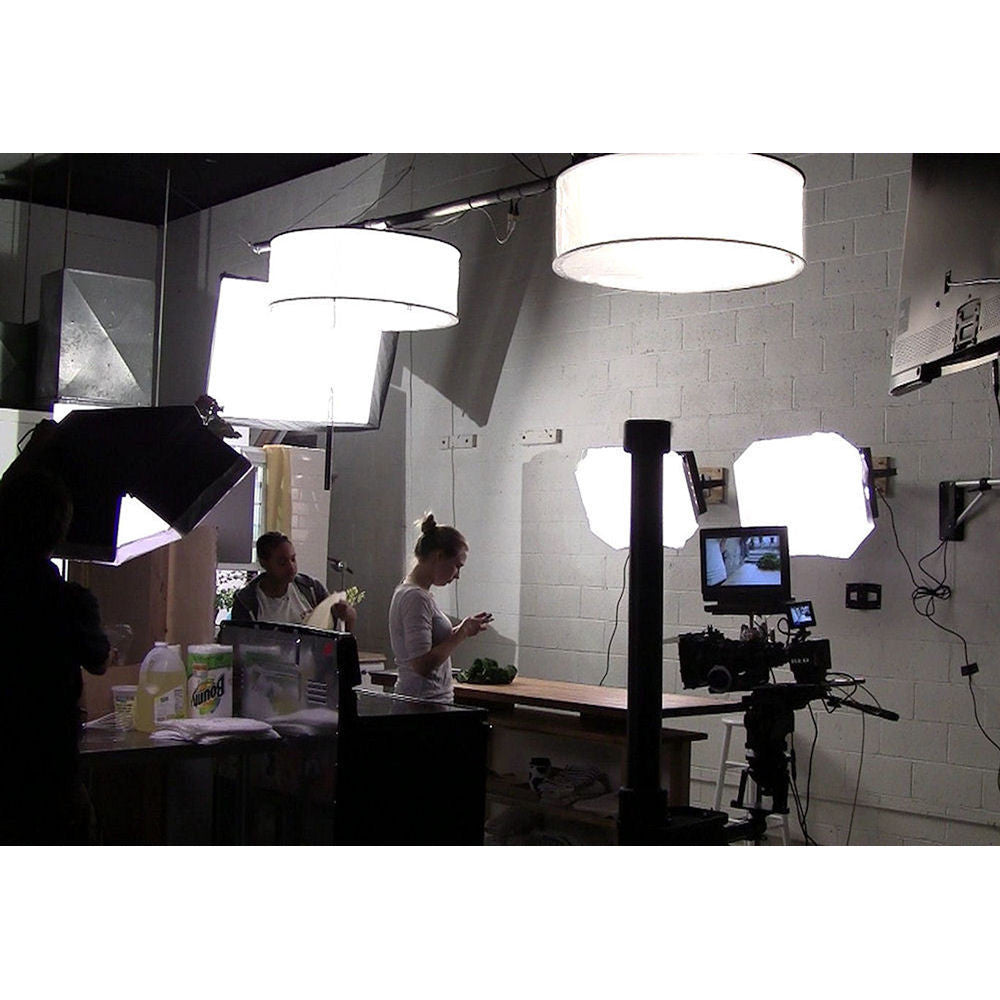 The ALZO Drum Overhead Light is a low profile soft light. It can be directly attached to a suspended ceiling or a boom. It incorporates a 4-socket fixture that holds the four large CFL light bulbs. It includes four touch fastener black-out flags to control light side spill. The light is portable as the diffuser (drum) collapses into a 14" disk with a zippered jacket. In addition, this lighting device stores very compactly.
