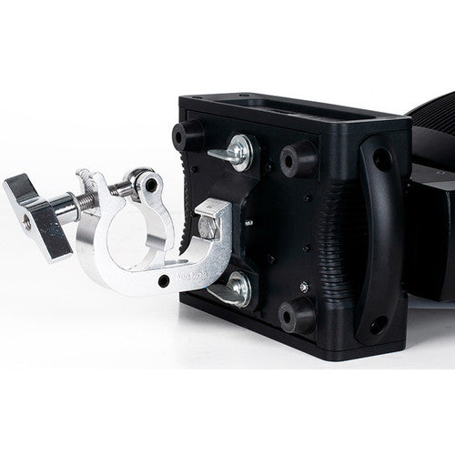 For controls, the unit features two DMX channel modes (22/25) with 5-pin XLR DMX input and output connectors. Multiple units can be daisy-chained to create complex lighting installations. The color display on the front panel shows DMX addressing and function settings, controllable via the six-button interface. A dedicated USB port is available for firmware updates. The Focus Spot 5Z includes an Omega bracket and a 6' locking power cable.