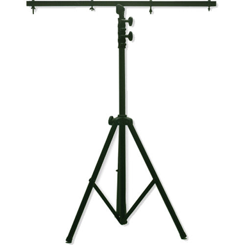 Ideal for DJs, traveling performers, or small theaters, the Tri-32 Tripod Light Stand from Eliminator Lighting rises to a maximum working height of 9', and it has a T-bar on top that can support four pin spots or PAR cans weighing up to 30 lb. The stand weighs 12 lb and folds down to 5 x 5 x 46" for storage and transport.