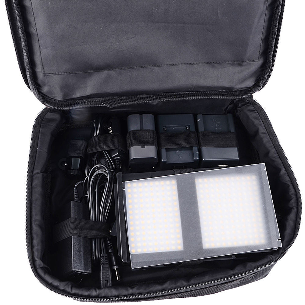 Included with the light is a removable four-leaf barndoor set, diffusion filter, two L-series batteries, two car charger power cords, and an AC adapter. A 1/4"-20 threaded hole allows you to mount the light to your camera's accessory shoe via the included ball adapter. You can also stack multiple FP-312 lights together using the interlocking rail system. An included soft carry case allows you to easily pack and carry your light unit, barndoors, and included accessories to and from shoots.