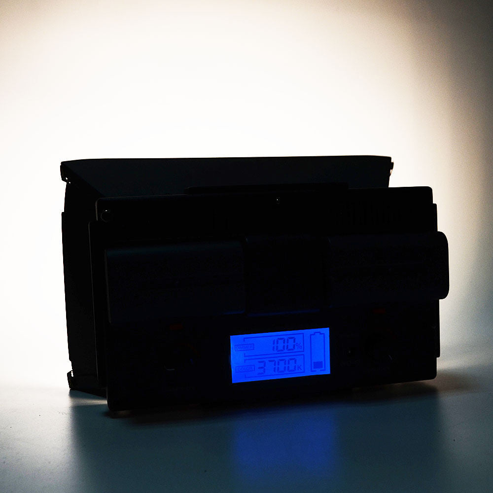 - The dimmer and color temperature settings are controlled by analog knobs, but the digital readout on the built-in display screen allows you to match the output of other units or repeat setups. The display also incorporates a four-step battery gauge so you know how much battery power you have remaining.