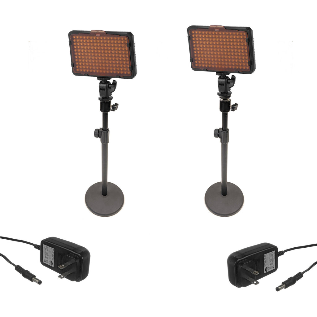Choose this WAFFLE 2-Light Kit with Tabletop Stands from Bescor when you need easy setup and storage. The kit includes two WAFFLE light panels, each with a tabletop stand and an AC power adapter. Each compact, lightweight panel has 176 LEDs, a 5600K color temperature, a CRI rating of 95, and a high lumen output.
