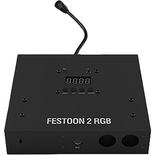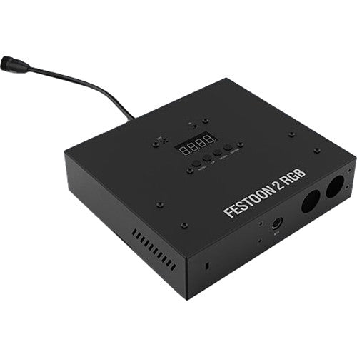 The Festoon can be controlled via DMX (3, 9, Pixel, or Pixel+) or by Standalone mode for the onboard digital display or the optional IRC-6 remote. The system can be expanded to include up to three strings (60 bulbs) total. The system includes a 16.4 extension cable and power cord.