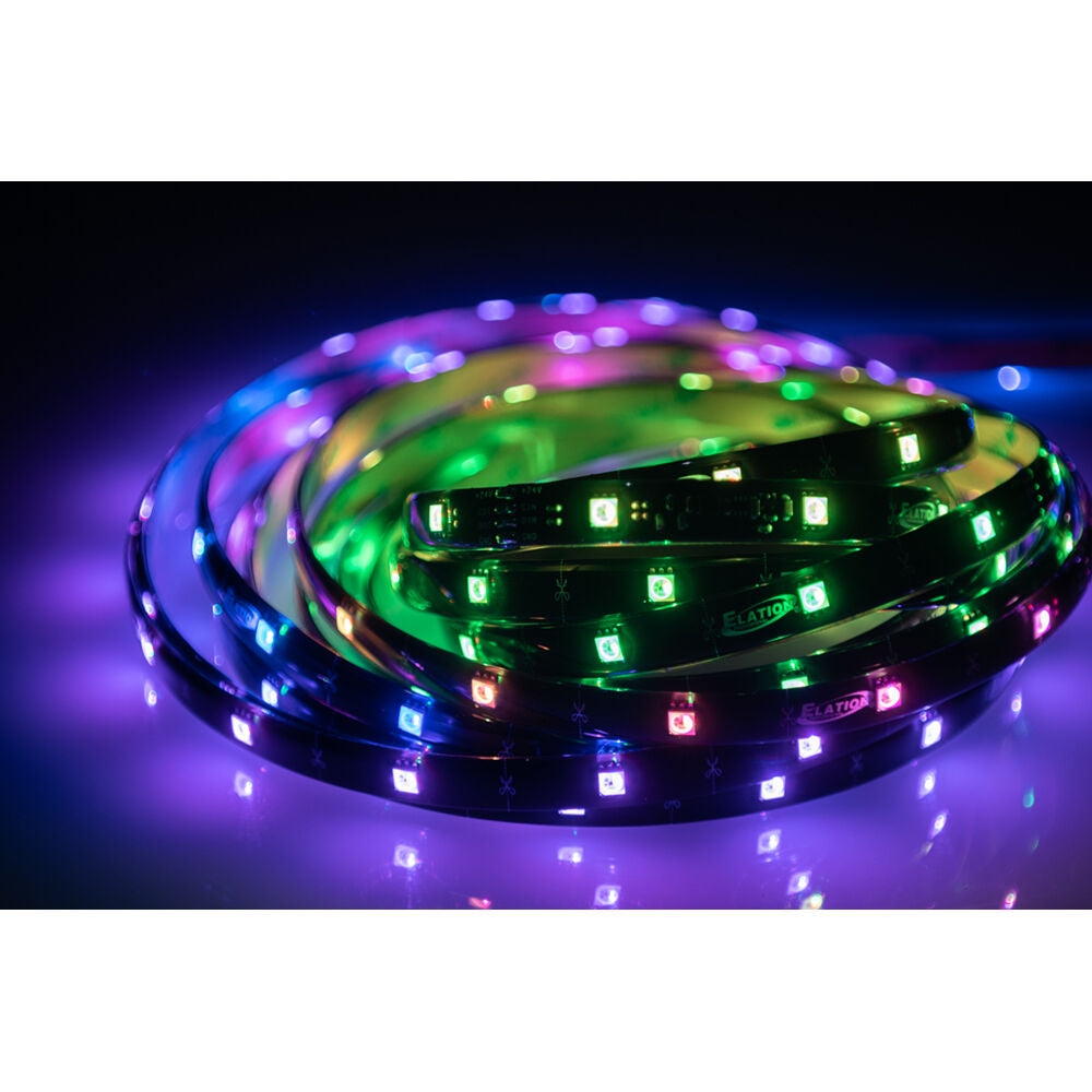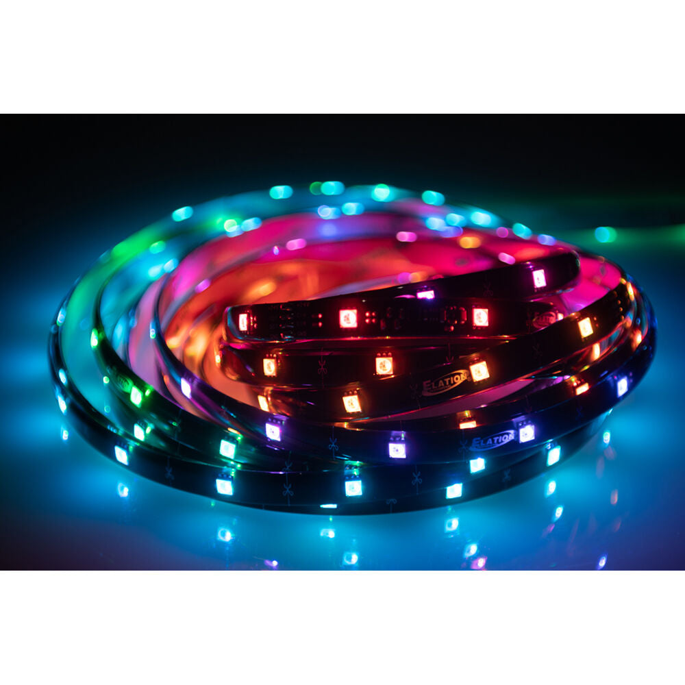 The 22.3' Elation Professional 40IP Flexible LED Pixel Tape is an outdoor-rated flexible LED pixel tape featuring 170 RGB SMD tri-color LED pixels (510 total DMX channels) spaced on 1.6" centers, producing over 1 billion color possibilities with a 120° viewing angle. Its surface has an IP65 conformal coating. The 40IP Pixel Tape can be powered and controlled using the Pixel Driver 170, Pixel Driver 1000IP, or Pixel Driver 4000 V2 control drivers.