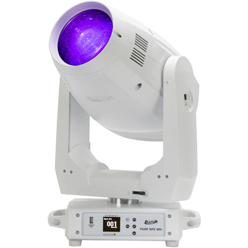 This white Elation Professional Fuze SFX Spot Fixture is a new concept LED Spot FX fixture designed for various applications requiring a compact and powerful multi-purpose luminaire. The SFX can project tight beams to wide washes using a highly efficient optical design while providing over 12,000 lumens of output from its 300W white LED engine. Housing 18 carefully designed gobos and a 4.5 to 38° zoom, the FUZE SFX can create stunning mid-air FX as easily as precise image projections.