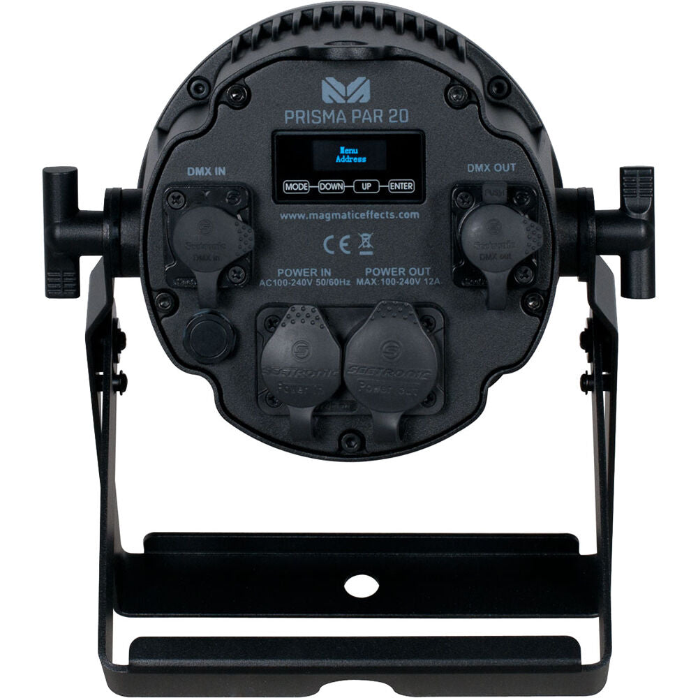 The Elation Professional Prisma PAR 20 is an exterior IP65-rated UV wash PAR luminaire that produces 365nm peak true UV output with zero visible light. Features include a 20-degree narrow beam angle, a user-friendly digital 2.5" LCD touchscreen control panel, intuitive DMX-512 and RDM control, dual adjustable mounting yokes, a durable aluminum housing, IP65 DMX 5-pin XLR, and locking power in/out connections.