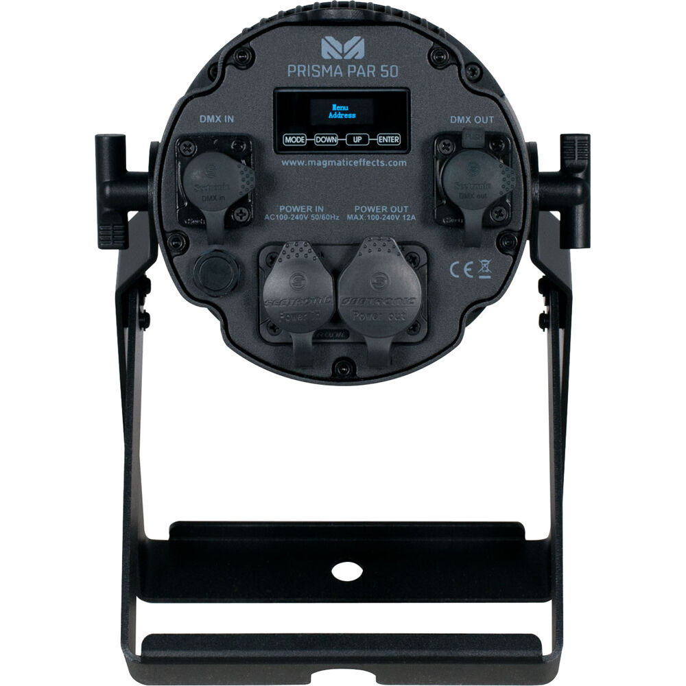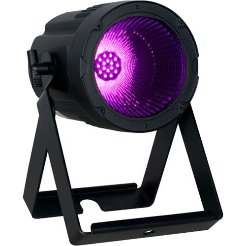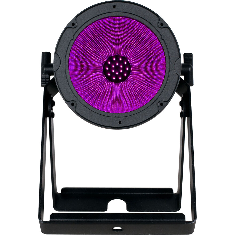 The Elation Professional Prisma Par 50 is an exterior IP65-rated UV wash par luminaire that produces 365nm peak true UV output with zero visible light, and an impressive 50 degree wide beam angle from the large internal LED reflector. Features includes a user friendly digital 2.5 inch LCD touch screen control panel, intuitive DMX-512 and RDM control, dual adjustable mounting yokes, a durable aluminum housing, and IP65 DMX 5pin XLR and locking power in/out connections.
