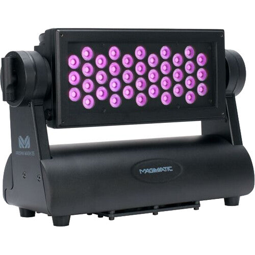 The Elation Professional Prisma Wash 25 UV Light is an exterior IP65-rated UV wash luminaire that produces 365nm peak true UV output with zero visible light. Features include a scoop LED reflector design that creates an impressive 20-degree narrow beam angle, manual adjustable tilt positioning, versatile rigging options, a user-friendly digital 2.5" LCD touchscreen control panel, intuitive DMX-512 and RDM control, and IP-rated power and data in/out.