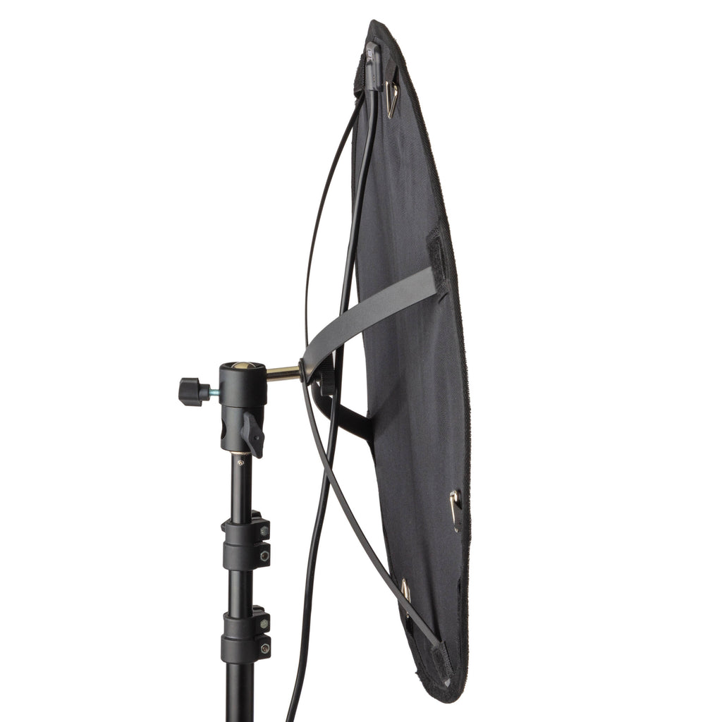 The PortaSun Round Flexible Bi-Color LED Light with Softbox and Grid V2 from Genaray is a lightweight, flexible, circular LED panel with a 20" diameter array, featuring 336 daylight and 336 tungsten LEDs to provide up to 5770 Lux of output. The X-bracket gives the bendable light panel rigidity that enables the use of light-shapers like the included softbox and grid, which attach in moments via a touch-fastener border on the front of the panel. The X-bracket has a ball head with 180° of tilt for precise aiming and a 5/8" receiver so you can mount it on most light stands.