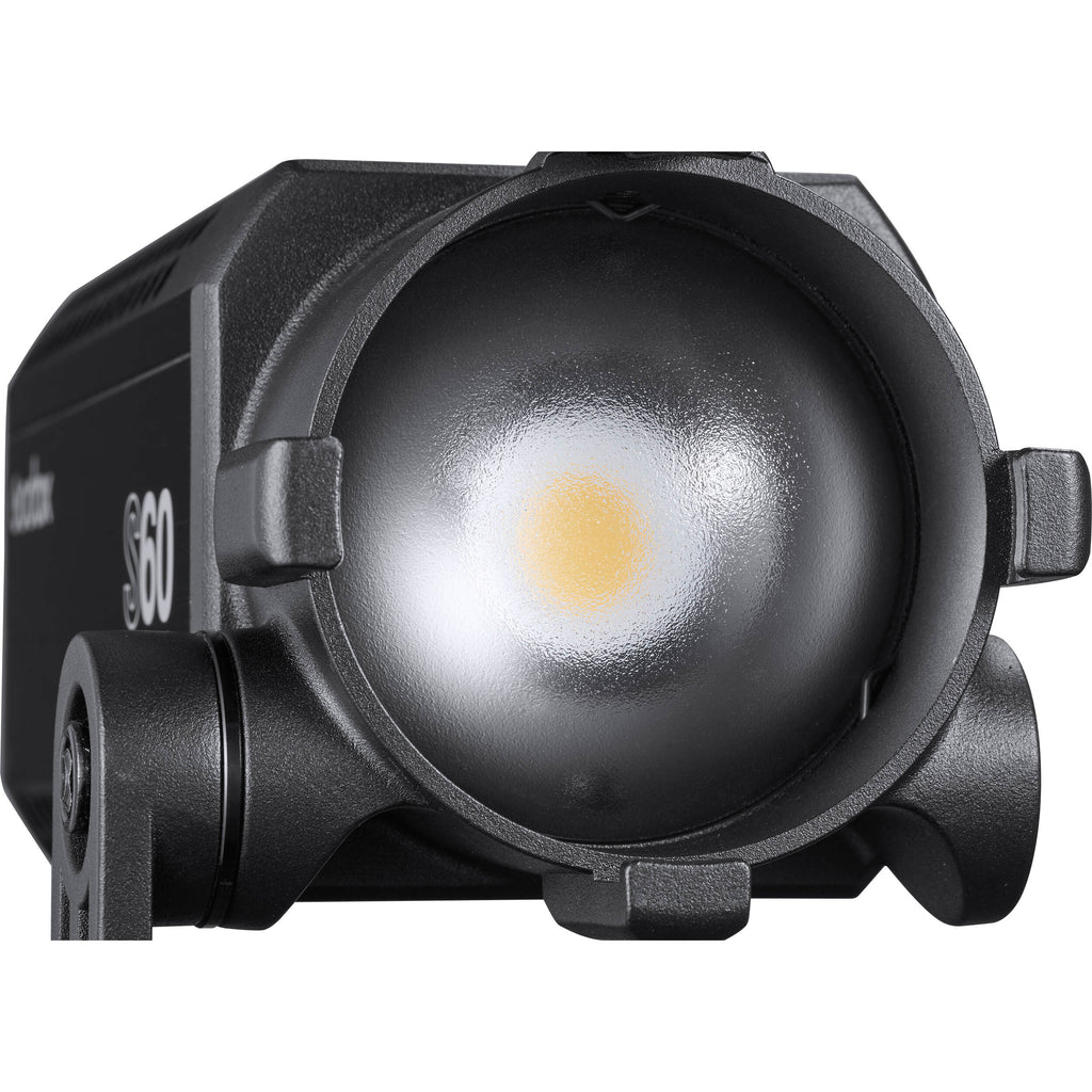 The S60 has a solid, consistent color temperature of 5600K that can be converted to tungsten balance with a simple gel filter, and is dimmable from 0-100%. While you can make these adjustments locally on the fixture, Godox offers several ways to make them remotely. The S60 is controllable from a console via onboard DMX, wirelessly with a smartphone app, or with an optional remote controller that has a range of 164'. The S60 is ready for worldwide use thanks to its 100 to 240V power supply, but you can also run it via its controller's V-mount battery plate when AC power is unavailable.