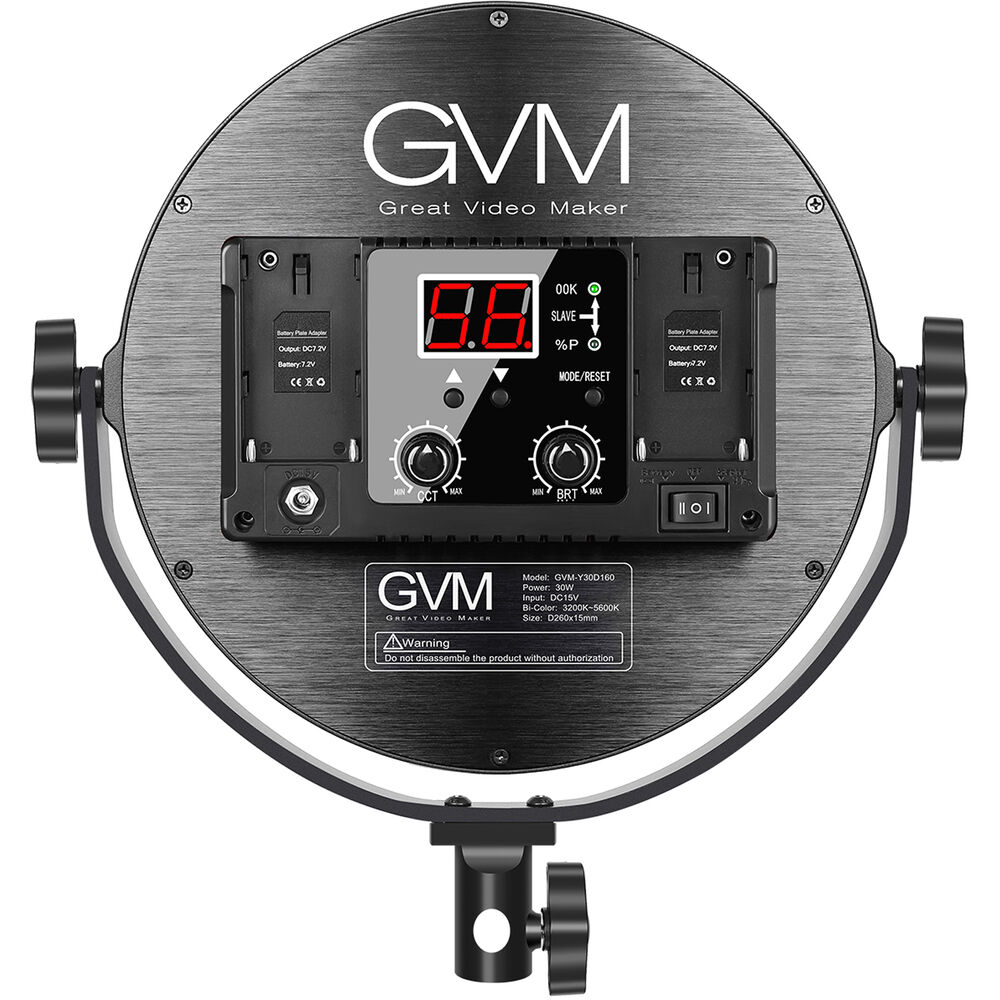 Color Temp: 3200 to 5600K, CRI/TLCI: 97Stepless Dimming, AC AdapterOptional NP-F Battery PowerDesktop Stand and Carry Case The Bi-Color Edge Video LED Soft Light (10") from GVM is a good choice for beauty, makeup, hair, or for use as a main light in fashion or portraiture. The round, dimmable fixture has a 10" diameter and variable color temperature from 3200 to 5600K to match ambient light conditions, other fixtures, or just for creative expression. A bonus of the light's form factor are the natural-looking catchlights reflected in your subject's eyes. While you can control adjustments locally on the fixture, you can also make them wirelessly via a smart device app. The Y30D160 runs on AC voltage but it will also run on two optional NP-F-type batteries when AC power is unavailable.