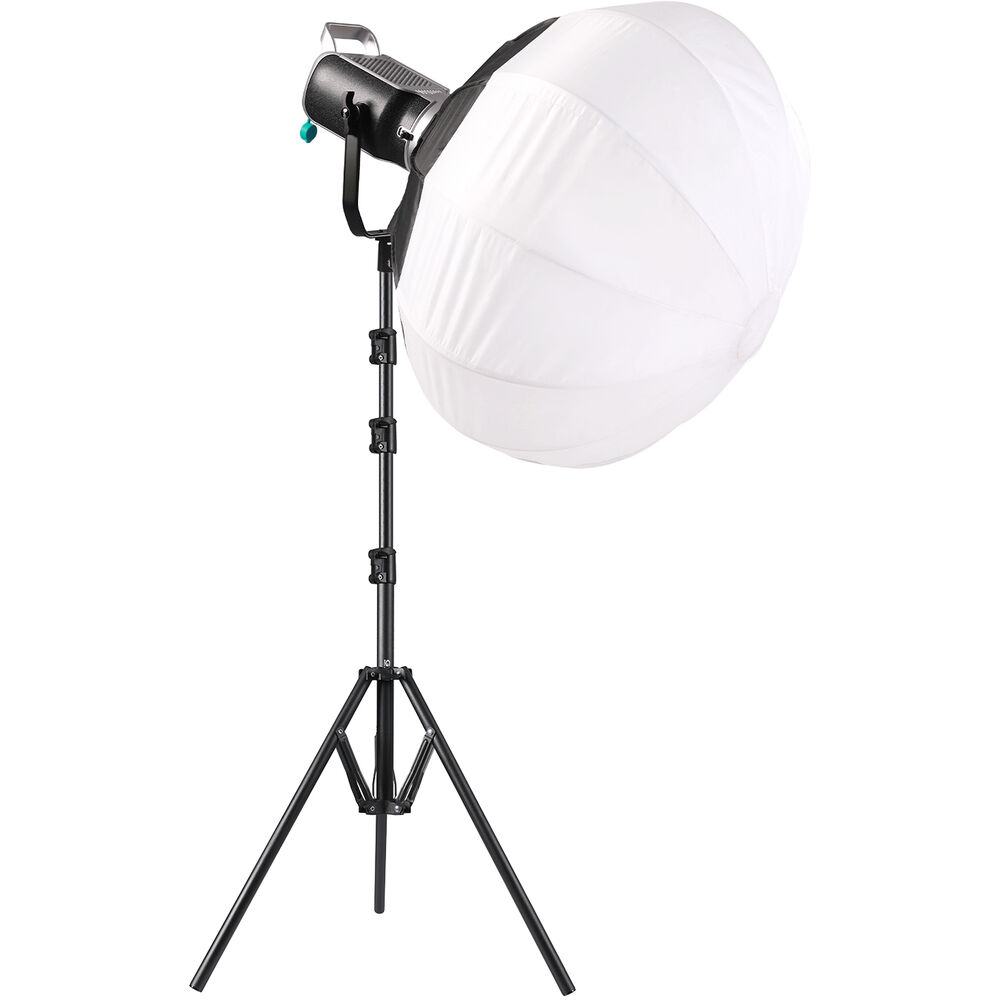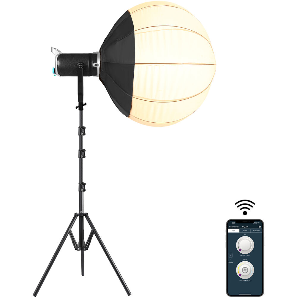 This SD300D Bi-Color LED Video Spotlight Kit with Stand and Softbox from GVM measures 13.7 x 9 x 5.2", is dimmable, and has a wide variable color range from 2700 to 7500K. It can output 56,600 lux at 3.3' and runs on universal 100 to 240 VAC. It comes with a reflector, a mini diffuser, and a carry bag for storage and transport. Also included are a light stand and a lantern softbox.