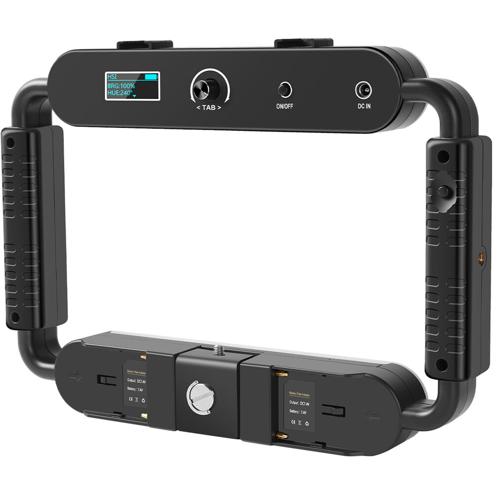 The TL15RS RGB Bi-Color Smartphone Video Camera Rig Light from GVM features a dual-handgrip and has an adjustable holder in the center to mount virtually any smartphone. The LEDs deliver a variable color temperature of 3200 to 5600K with 1 to 99% brightness dimming. An included battery neatly installs on the back and powers the light. A photo trigger on one of the handgrips works wirelessly over Bluetooth so you can take photos with your phone without taking your hands off the handgrips. Additionally, two shoe mounts allow you to attach accessories to the top, and 1/4"-20 threads let you mount the rig on a tripod or stand in vertical or horizontal setups.