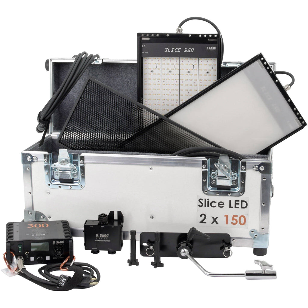 K5600 has put together this Slice 150 x2 Kit to give shooters in the studio or on location the benefits of this unique light source. The kit includes two 2 x 1' Slice panels, a 300W ballast, splitter box, and a 25' extension cable. Provided mounting accessories include a 3/8" pin with cold shoe mount, back plate, rounded top cold shoe, 4-point lock-down knob, and a lollipop mount with Baby receiver. It all fits in the kit's carrying case.
