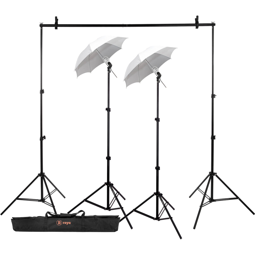 The Raya Portable Studio Kit was put together by B&H to give photographers a lightweight core setup for portraits, products, and general photography. The kit includes a background support system with carry case which can handle 53" seamless paper or up to 10' wide muslin backgrounds. Two A-clamps are included to secure the background. Also included are an LED Lamp Holder with an umbrella socket to hold the included 33" translucent umbrella and a 60W Edison-based LED lamp that outputs the tungsten equivalent of 250W.