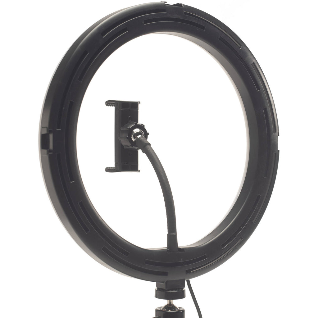 Adopting the familiar, circular form factor, the Tri-Color LED Ring Light from Smith-Victor measures 10" and produces the near-shadowless lighting that is a hallmark of its shape and complimentary to skin tones. Great for beauty, makeup, hair styling, and selfies via its adjustable phone mount, the light has 3000, 4000, and 5500K color presets and 11 brightness levels. A metal tabletop tripod is includes for hands-free use.