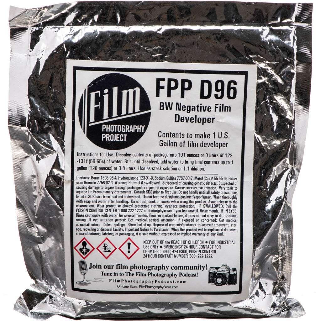 The D96 Black and White Film Developer from Film Photography Project is a powder-based film developer for black and white motion picture stocks, which also works well for tradition and modern-T-grain film stocks. Providing a cine-inspired look, this forgiving and low-contrast film developer has the ability to increase contrast by increasing your developing times or agitation. The powder will make 1 gal of stock solution for developing up to 50 rolls of 35mm film and development time is 7 to 8.5 minutes.