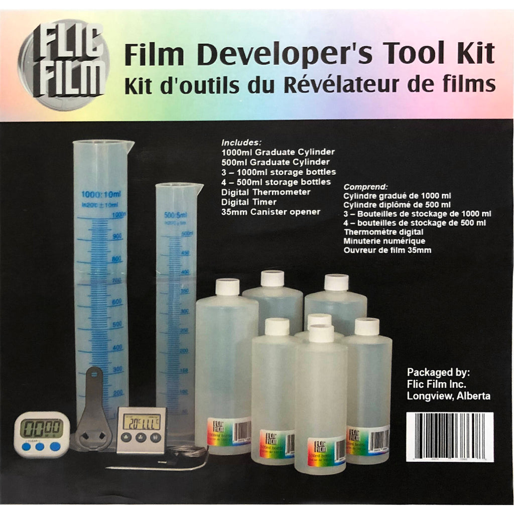The Film Developer's Tool Kit by Flic Film provides all the ebasic hardware for processing at home. Consistency and repetition are critical aspects of the process, which is why the kit includes a timer and digital thermometer, allowing you to obtain the best results each time. Measurement and storage are equally important, resulting in a longer shelf life for your chemicals and balanced development. For this, you can use the 1L and 500mL graduated cylinders, three 1000mL storage bottles, and four 500mL storage bottles. Additionally, the kit includes a 35mm canister opener.