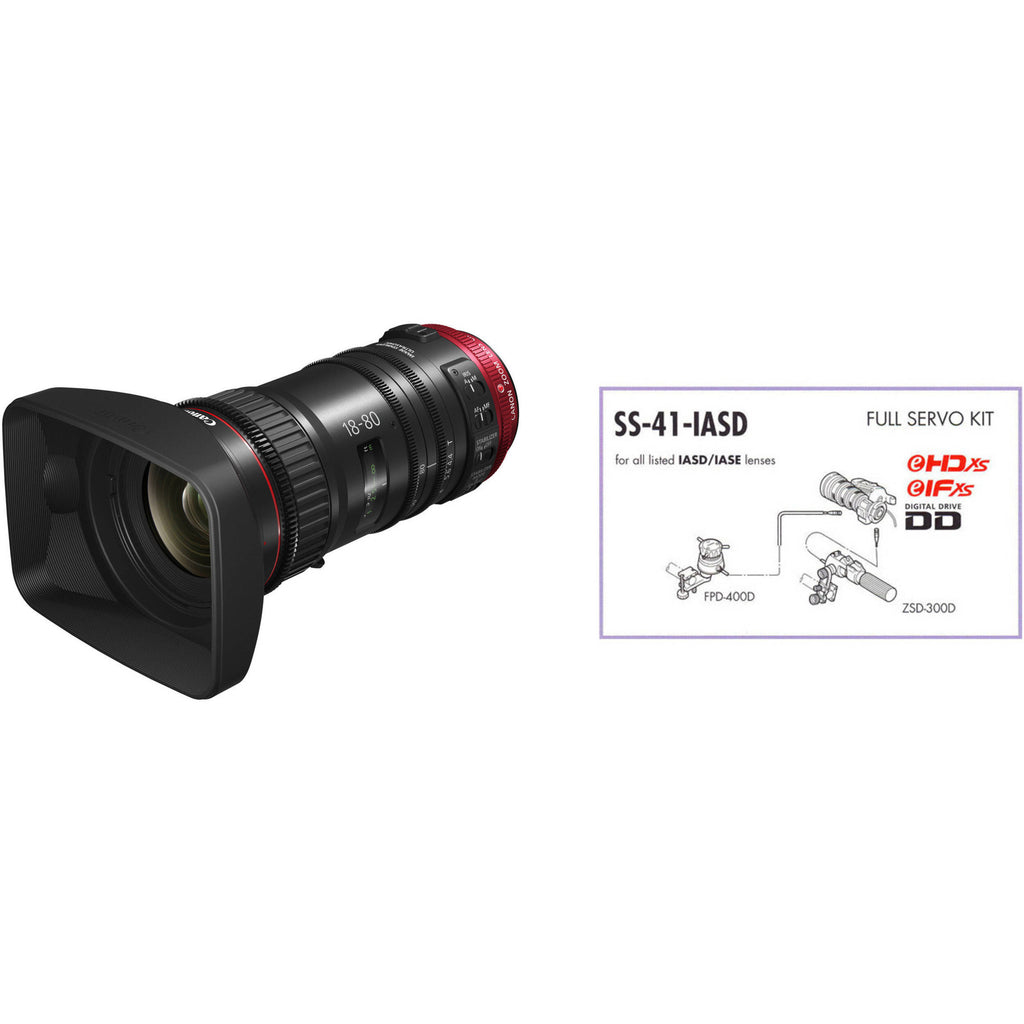 Perfect for narrative or documentary capture, the Canon COMPACT-SERVO 18-80mm T4.4 EF Zoom Lens with SS-41-IASD Kit put together by offers both cine- and broadcast-style features for EF-mount cameras with Super35 and APS-C formats. This kit pairs the CN-E 18-80mm T4.4 compact servo zoom lens with the SS-41-IASD Full-Servo kit. The servo kit includes a focus controller, digital servo zoom demand, and connection cables.