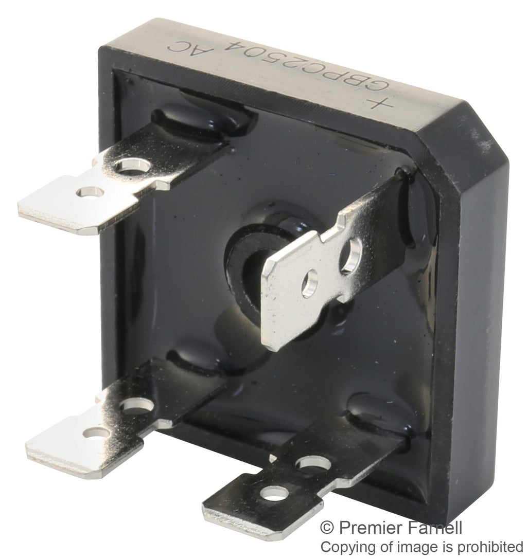 The GBPC2504 from Multicomp Pro is a single phase bridge rectifier with solderable terminals. The rectifier bridge consists of four silicon junctions connected as a full bridge. Integrally moulded heatsink provide very low thermal resistance for maximum heat dissipation.