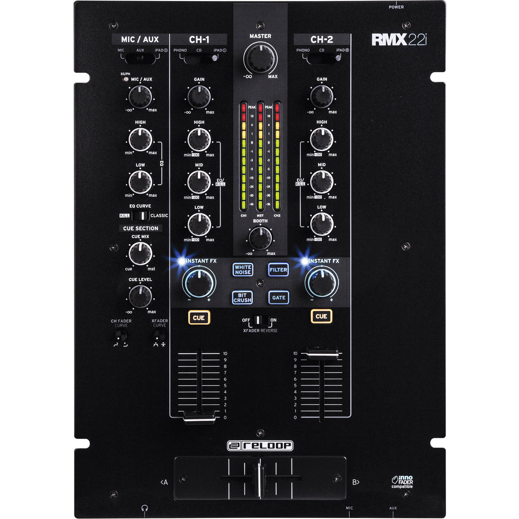 Each channel features a 3-band EQ that is switchable between isolator and classic EQ to suit any individual mixing styles. The instant sound FX section is available on any channel, with dedicated potentiometers for control and manipulation. The effects offered include white noise, filter, bit crush, and gate. The 1.8" / 45.0 mm crossfader is replaceable and compatible with innoFADER. The crossfader also features fader-start, reverse, and curve control. The Remix 22i ships with the audio split cable and an international power supply.