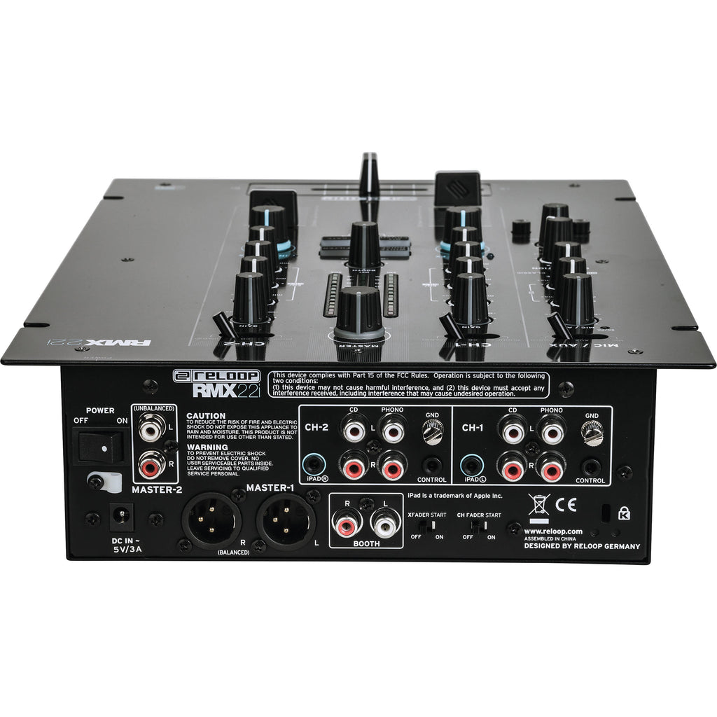 The RMX-22i from Reloop is a 2+1 channel DJ mixer with built-in digital effects and connectivity for smartphones and tablets for professional DJs, serious home enthusiasts, and clubs. The mixer boasts a total of 8 inputs, with channels 1 & 2 featuring line and phono RCA inputs, as well as 1/8" / 3.5mm jacks for connecting any smartphone or tablet. The included audio splitter cable divides the output of the device into two separate mono channels for split cuing, or one stereo channel for production or sampler apps.