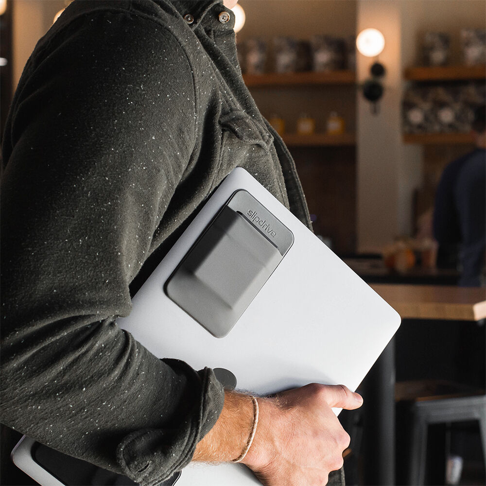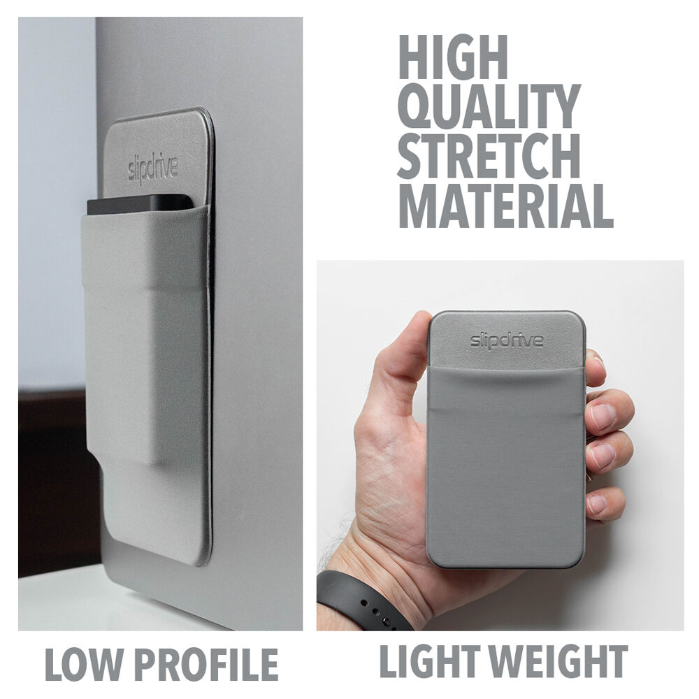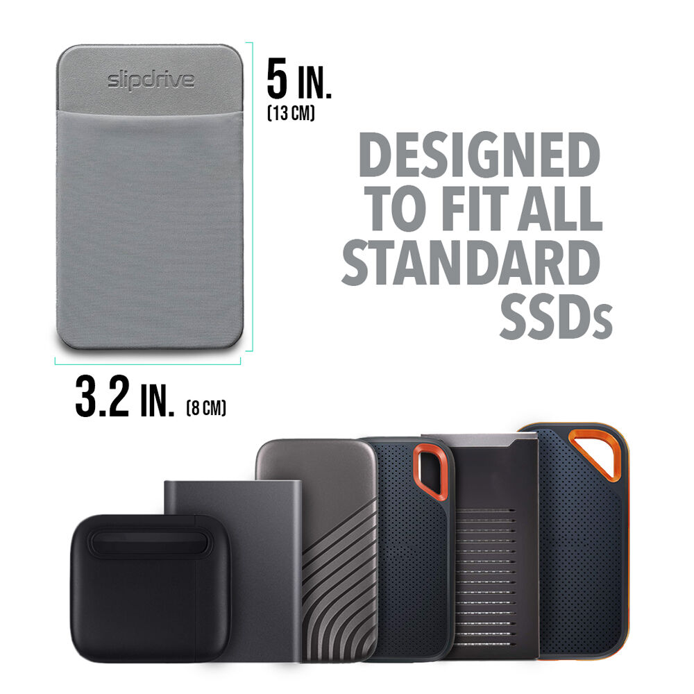The small, gray Slipdrive from Max Huggins can safely store your external SSD by attaching it to the back of your laptop or tablet. You'll no longer have to deal with a dangling SSD. The 3M adhesive binds securely to surfaces and doesn't leave residue behind. It also retains its adhesion if removed so you can move the Slipdrive to another position or to another laptop. The elastic sleeve and internal strap ensure that your external SSD is safe and secure.