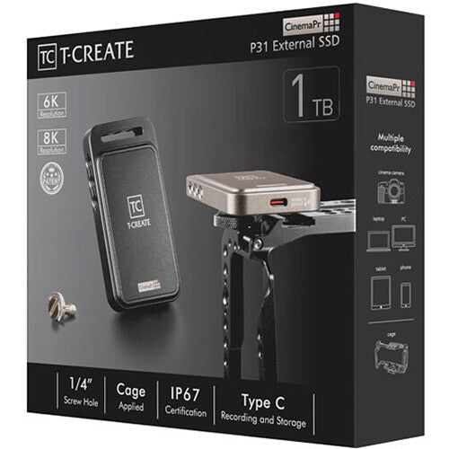 The 1TB T-CREATE CinemaPr P31 USB 3.2 Gen 2x2 External SSD from Team Group is designed for use with professional camera cages, digital SLR cameras, or mobile phones to record video at resolutions up to 8K. It may also be used for backing up data at speeds up to 1000 MB/s using its USB-C 3.2 Gen 2x2 interface and has a storage capacity of 1TB. Built using CNC-machined aluminum, this SSD is not only rugged and durable with effective heat dissipation, but is IP67 certified for protection against water and dust and can withstand drops from up to 6.6' onto a carpeted floor. Compatible with Windows, Mac, and Linux, the P31 is powered using its USB-C interface and features twelve 1/4" screw holes and a screw hole for adapters.