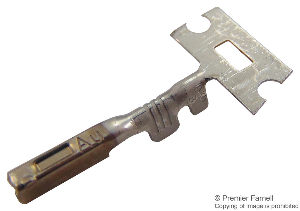 The 33467-0006 from Molex is a single row 2.54mm pitch MX64 female terminal. This receptacle crimp terminal is made of copper metal with gold plating. It mates with sensors and other USCAR interfaces and used with MX64 sealed single row crimp housing 31403 and MX123 female receptacle housing 34566, 34576.