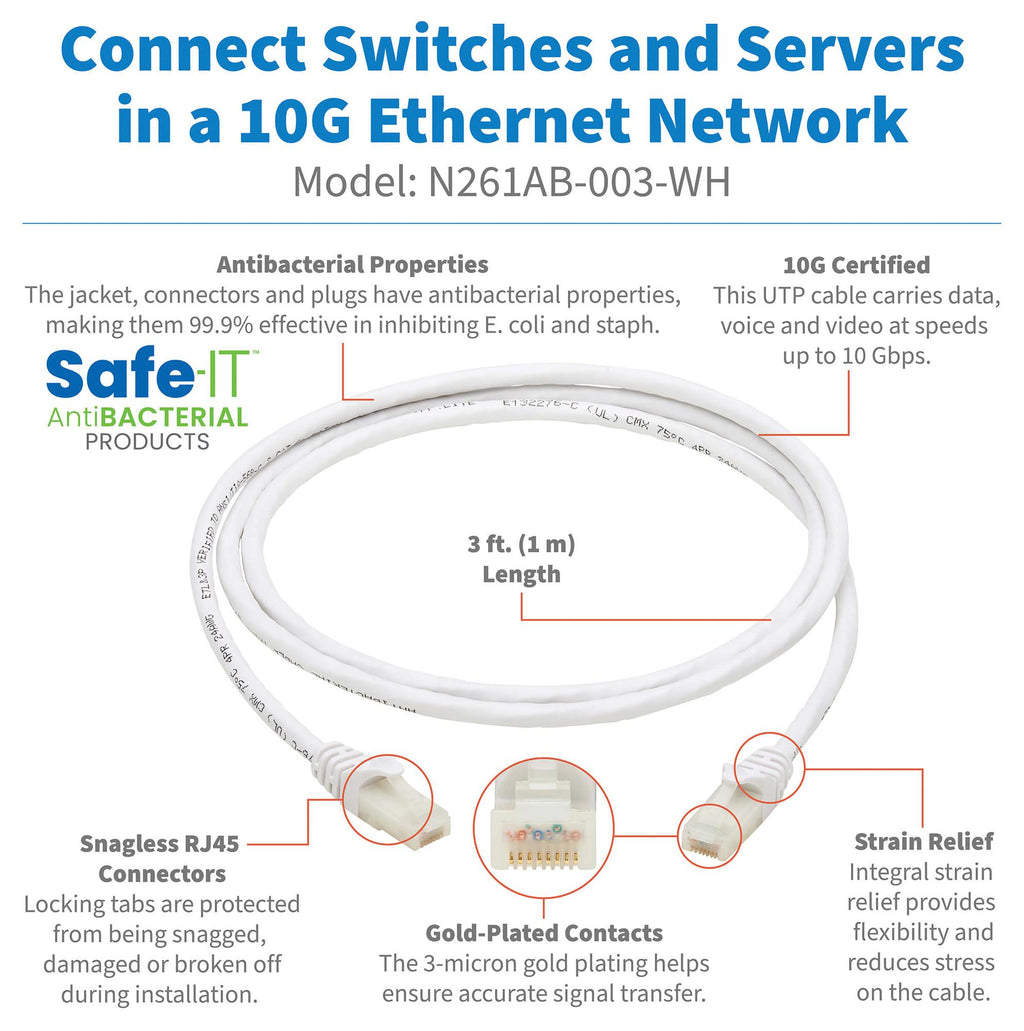 This is a N261AB-003-WH ENET CABLE , RJ45 PLUG-PLUG, 3FT, WHITE product from TRIPP-LITE with the model number N261AB-003-WH