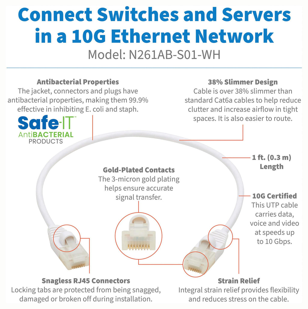 This is a N261AB-S01-WH ENET CABLE , RJ45 PLUG-PLUG, 1FT, WHITE product from TRIPP-LITE with the model number N261AB-S01-WH