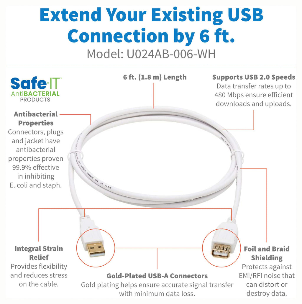 This is a U024AB-006-WH USB CABLE , 2.0 TYPE A PLUG-A RCPT, 6FT product from TRIPP-LITE with the model number U024AB-006-WH