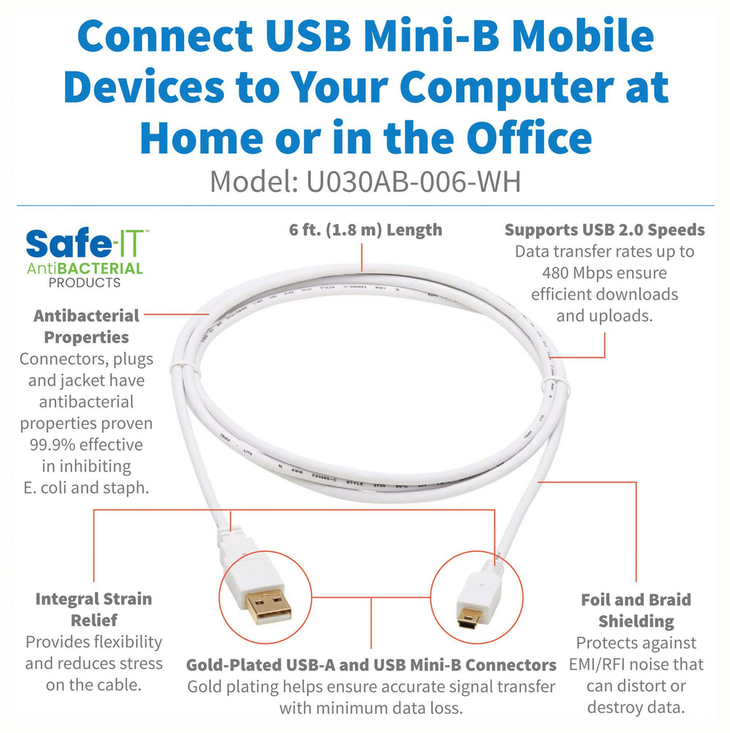 TRIPP-LITE U030AB-006-WH U030AB-006-WH USB Cable 2.0 Type A-MINI B Plug 6FT