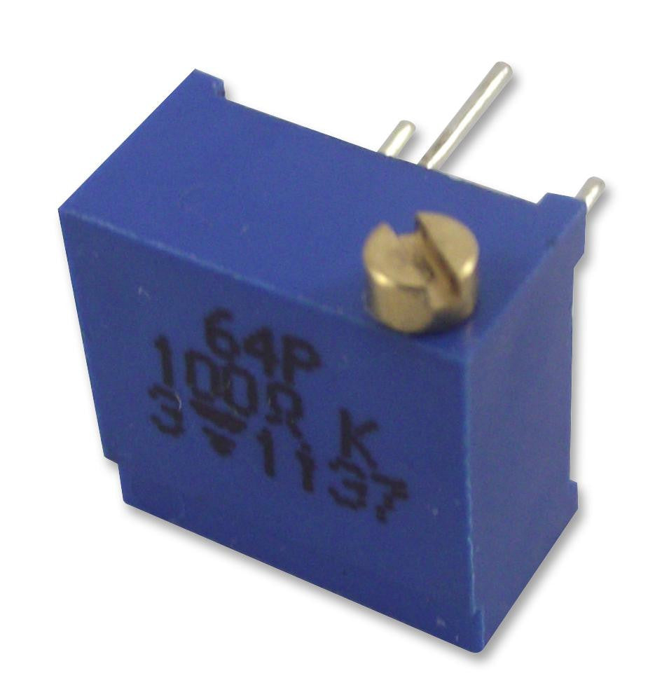 The Vishay 64 series are cermet, through hole trimming potentiometers. These potentiometers are multi-turn, small size with PC board mounting. Available in five versions (P, W, X, Y, Z) which differ by the position of the control screw in relation to the PC board plane and by the spacing of the terminals. Excellent operational stability is provided by the use of a cermet element.