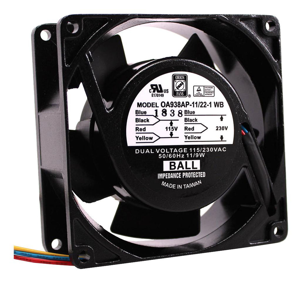 This is a OA938AP-11/22-1WB AXIAL FAN , BALL, 50CFM, 32DB, 9W, 230VAC product from ORION FANS with the model number OA938AP-11/22-1WB