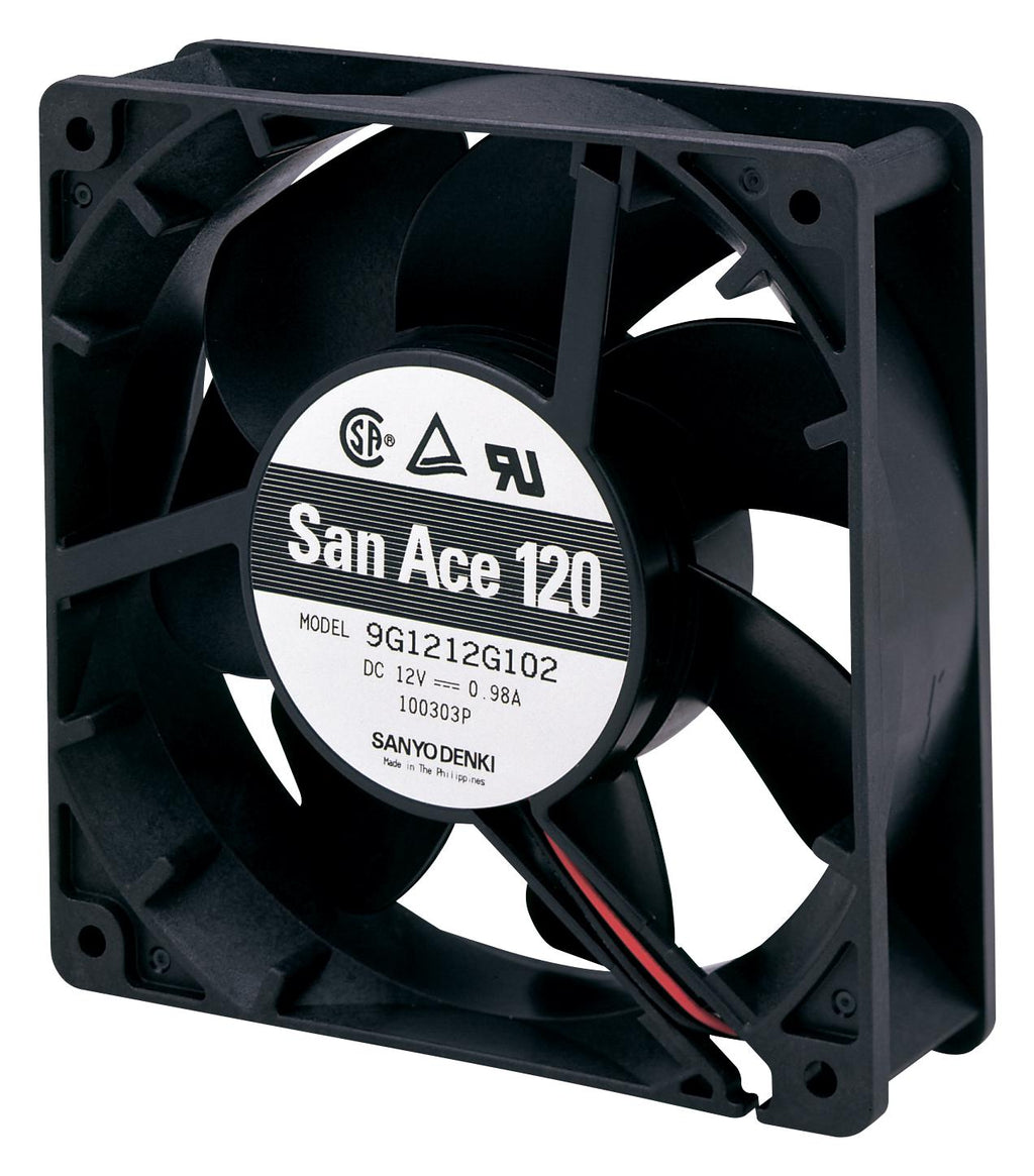 The 9G1224M401 is a 24VDC 25mm thick Axial Fan with pulse sensor, ball bearing and wire leaded power connection. This San Ace 120-series 9G-type fan comes with plastic frame and impeller. UL1007, 24AWG +red and -black lead wire. Clockwise direction of rotation viewed from front of fan blade and continuously run in a free air state.
