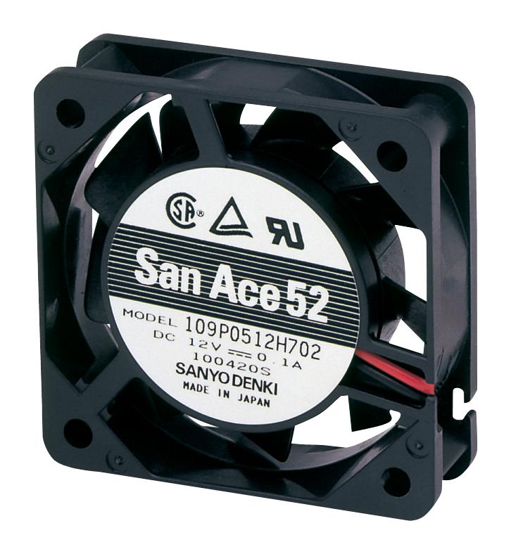 This is a Axial Fan, 12 VDC, DC, 52 mm, 15 mm, 27 dBA, 9 cu.ft/min product from SANYO DENKI - SANACE FANS with the model number 109P0512H702