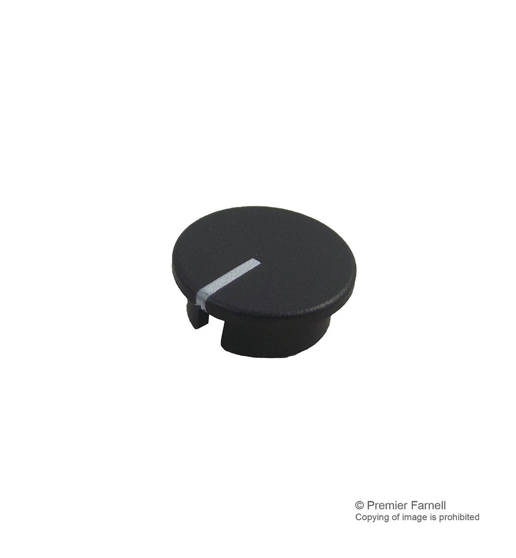 The CP-AA19A-6/C is a black Round Cap with indicator line. It is made of plastic. This round cap is suitable for use with the CPBT-AA19A knob.