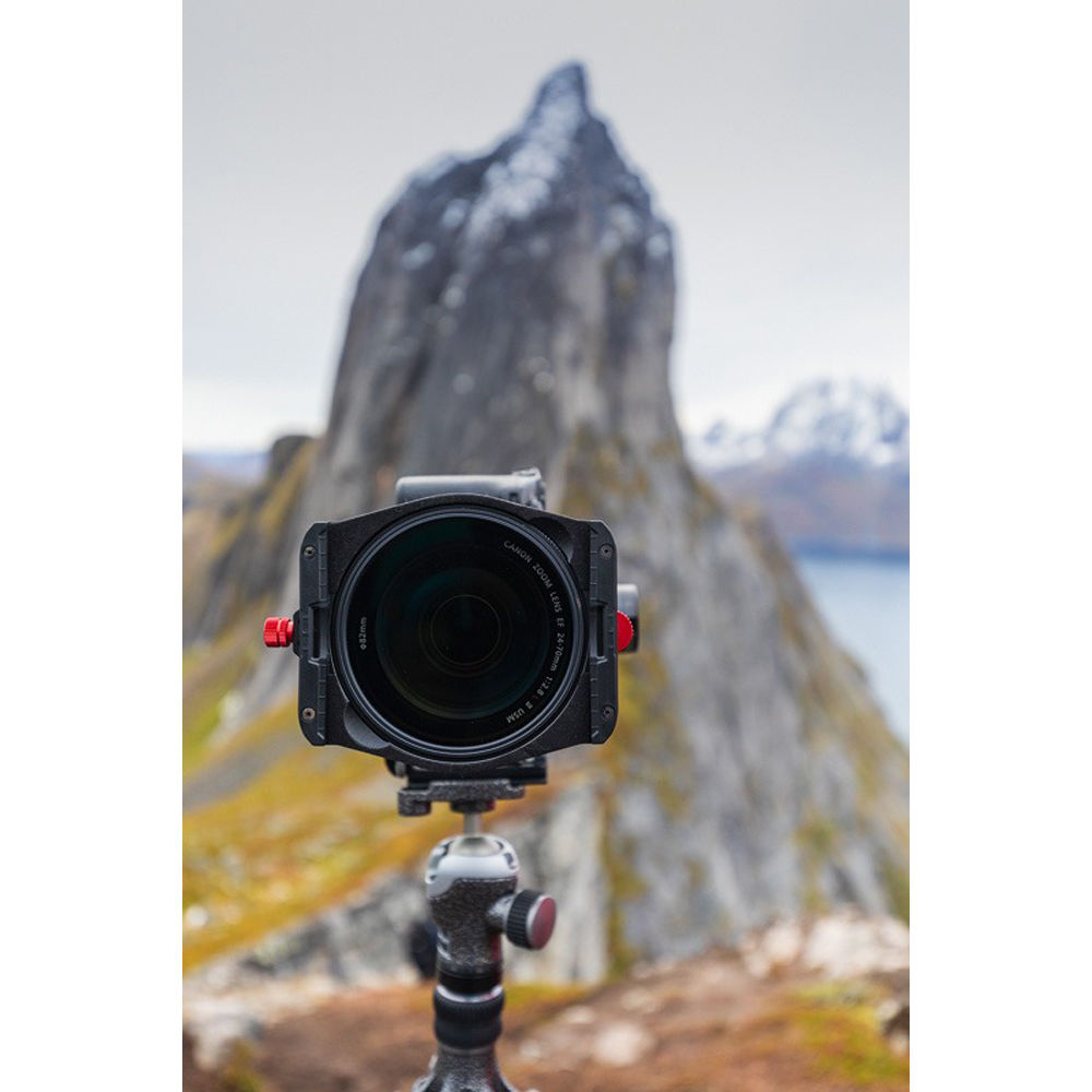 Utilizing a modular filter slot system, this Kase K9 100mm Filter Holder Kit allows for the convenient use of up to three separately available 100mm wide, 2mm thick filters along with an included Kase 90mm Magnetic Circular Polarizer Filter that is designed to avoid vignetting when used with a wide-angle lens. The slot system can also be reconfigured so that the kit's filter holder accommodates up to three, separately available 100mm wide, 1.1mm thick filters along with the circular polarizer filter. While in use, the circular polarizer filter magnetically fits within the filter holder system so it can be quickly installed, removed, or switched with a different Kase 90mm magnetic filter depending on the subject or changing lighting conditions.