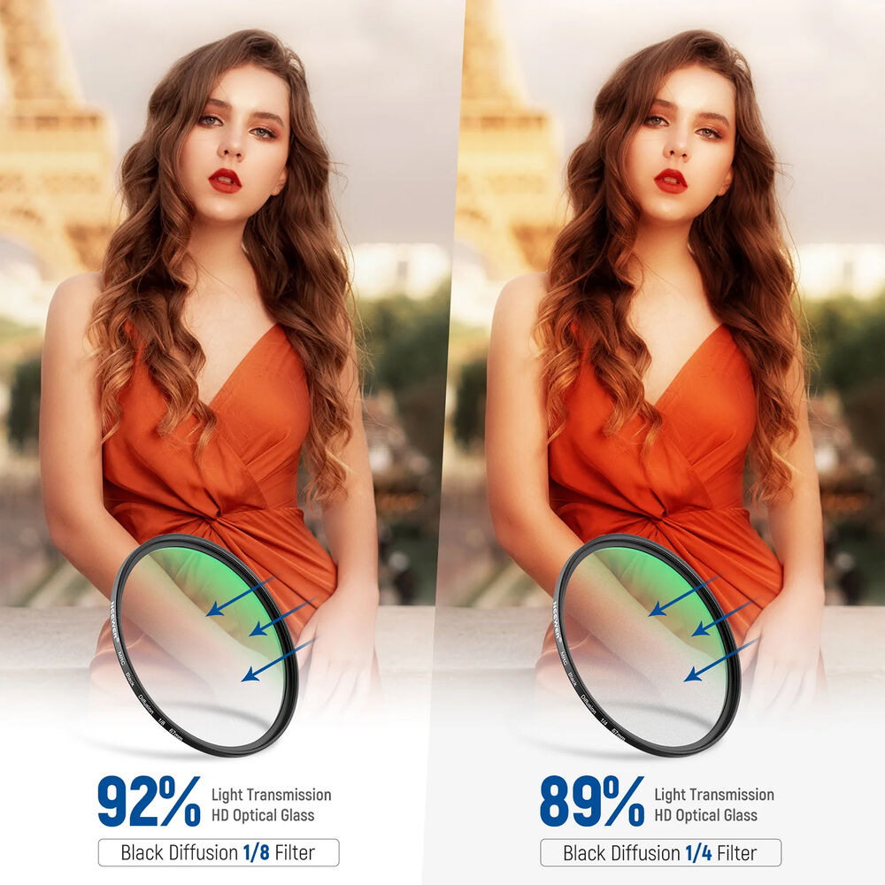 The 49mm Neewer 2-Piece Black Diffusion Filter Kit creates cinematic effects with 1/4 and 1/8 density. The filters help reduce highlights and lower the glare, making the skin look smoother and giving the tone a hazier and softer look. With the dreamy hazy film effects, they are ideal for portrait photography and video recording. Made of cutting-edge HD optical glass with premium light transmission, these lens filters lower contrast, soften the appearance of skin wrinkles and pores, and provide a practical and increased halo that adds a pleasingly warm depth to the image. The 30 layers of nanocoatings on both sides of the filters make them waterproof, scratch-resistant, and oilproof, to effectively reduce the reflection coming from all directions and the filter itself.