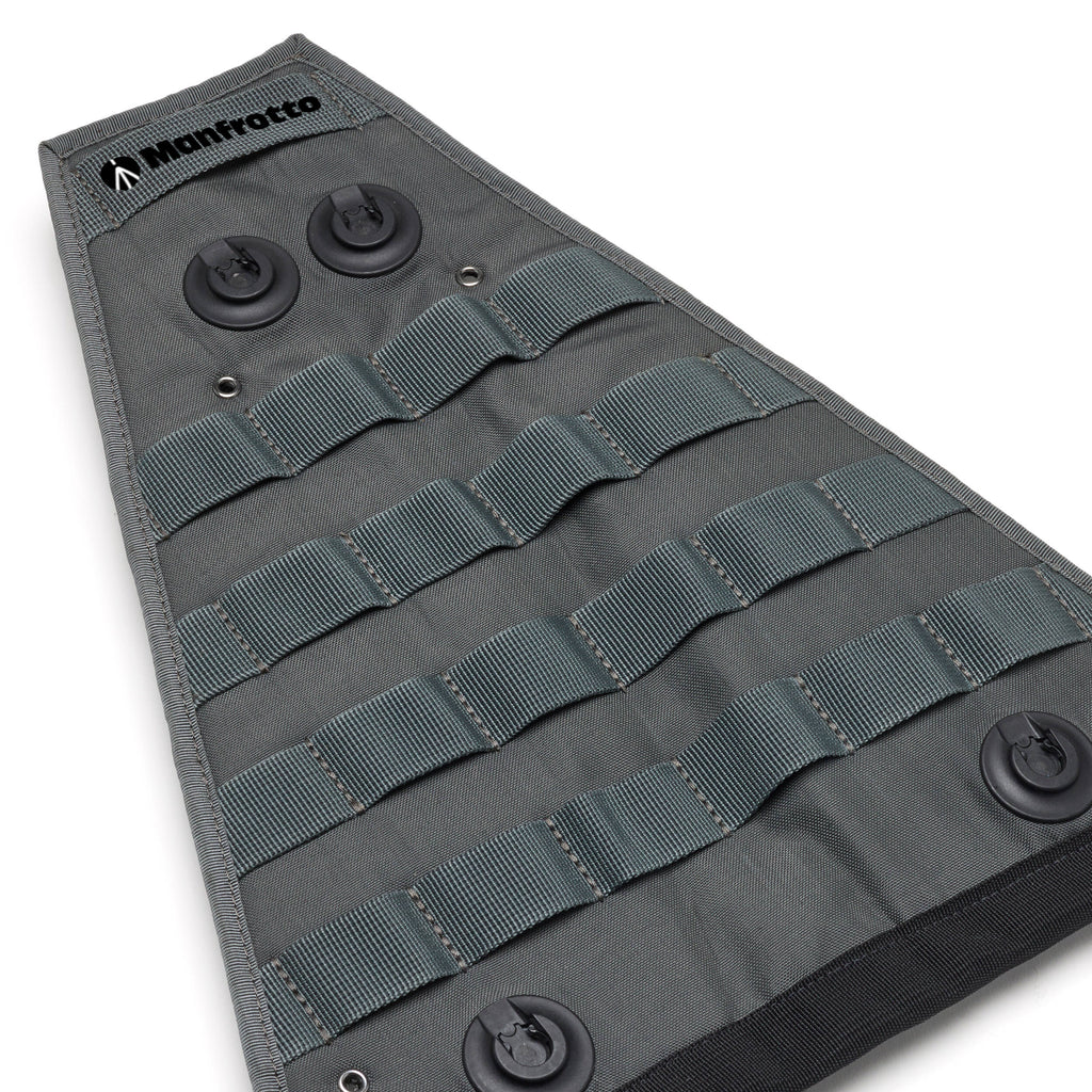 The triangular Manfrotto Alpha S.H.O.T. Leg Organizer provides a place to attach pouches, packs, and other compatible accessories right on your tripod for easy access while shooting or hunting. The organizer has four rows of MOLLE loops and four Fidlock attachment points and works with many of the organizational products in Manfrotto's Alpha S.H.O.T. line. Its leg loops fit on tripod legs of all sizes and the organizer can be left in place while the tripod is folded.