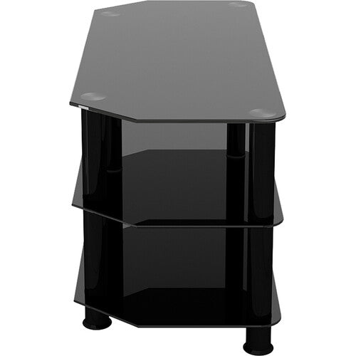 The 39" Classic Corner Glass TV Stand from AVF Group is an easy to construct, contemporary, and versatile solution for your home entertainment needs. The black tempered safety glass and durable stainless steel legs modernize any space, while the angled corners save valuable space when placed into a corner of your room. Arrange your various A/V components on the middle and bottom shelves.