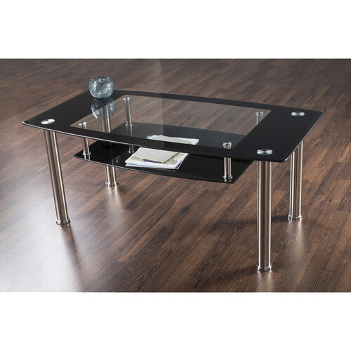 A contemporary black glass and chrome effect Coffee Table, from AVF, this table features clear top window looking through to a suspended lower magazine shelf. It's a must have versatile solution for your home needs that is sturdy in design and easy to assemble.
