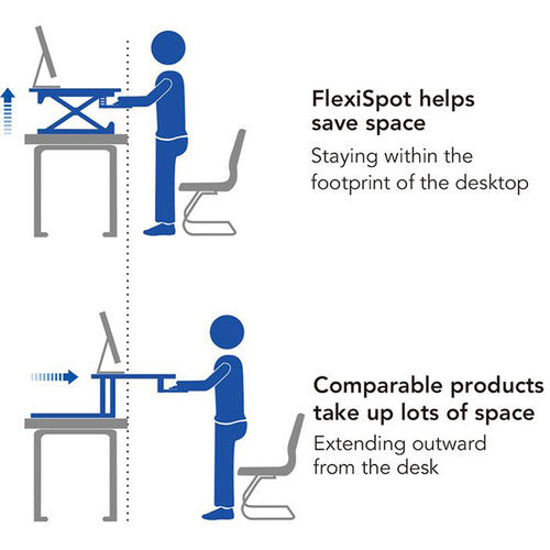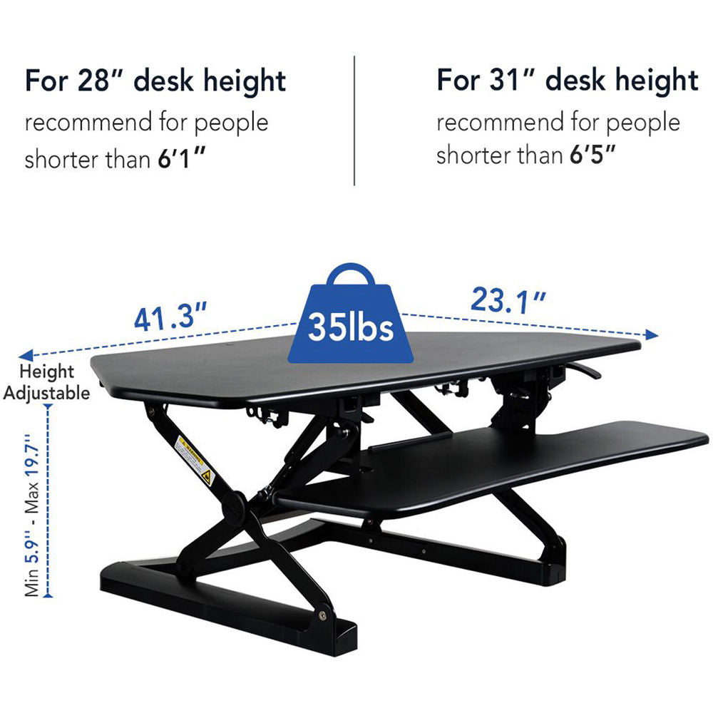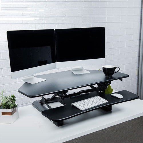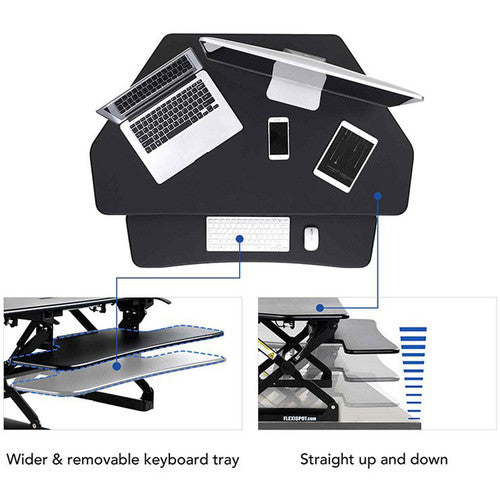 The black FlexiSpot 41" Sit-to-Stand Desk Riser brings flexible sit-to-stand adjustment to your workstation. Supporting a single monitor up to 30" or dual monitors up to 27", this stand's surface area measures 41.3 by 23.1". Adjust the height from 5.9 to 19.7". An integrated tray holds your keyboard and mouse. This stand features a total load capacity of 35 pounds.