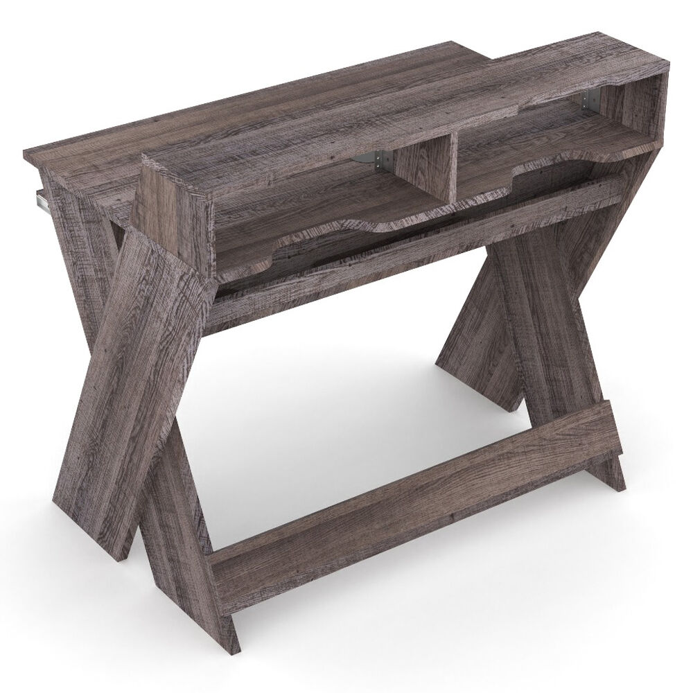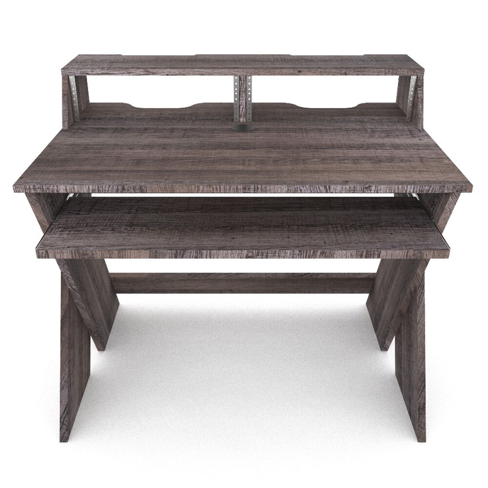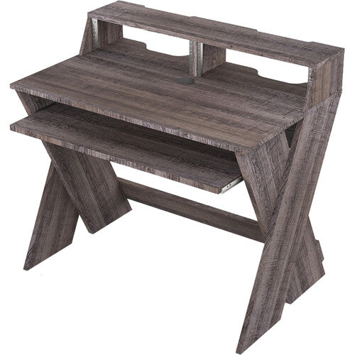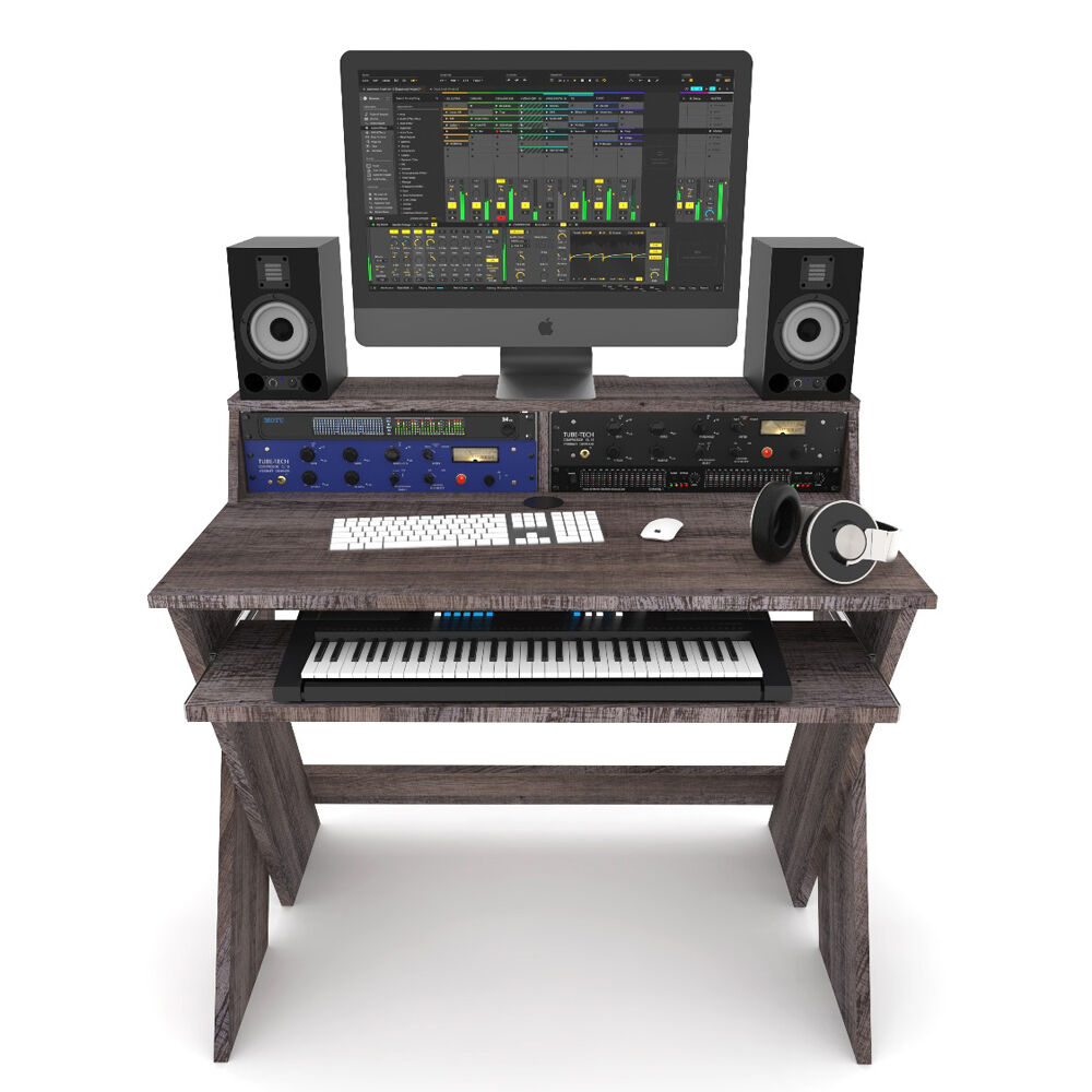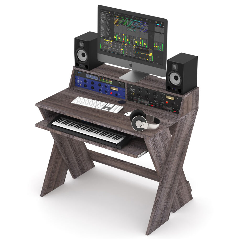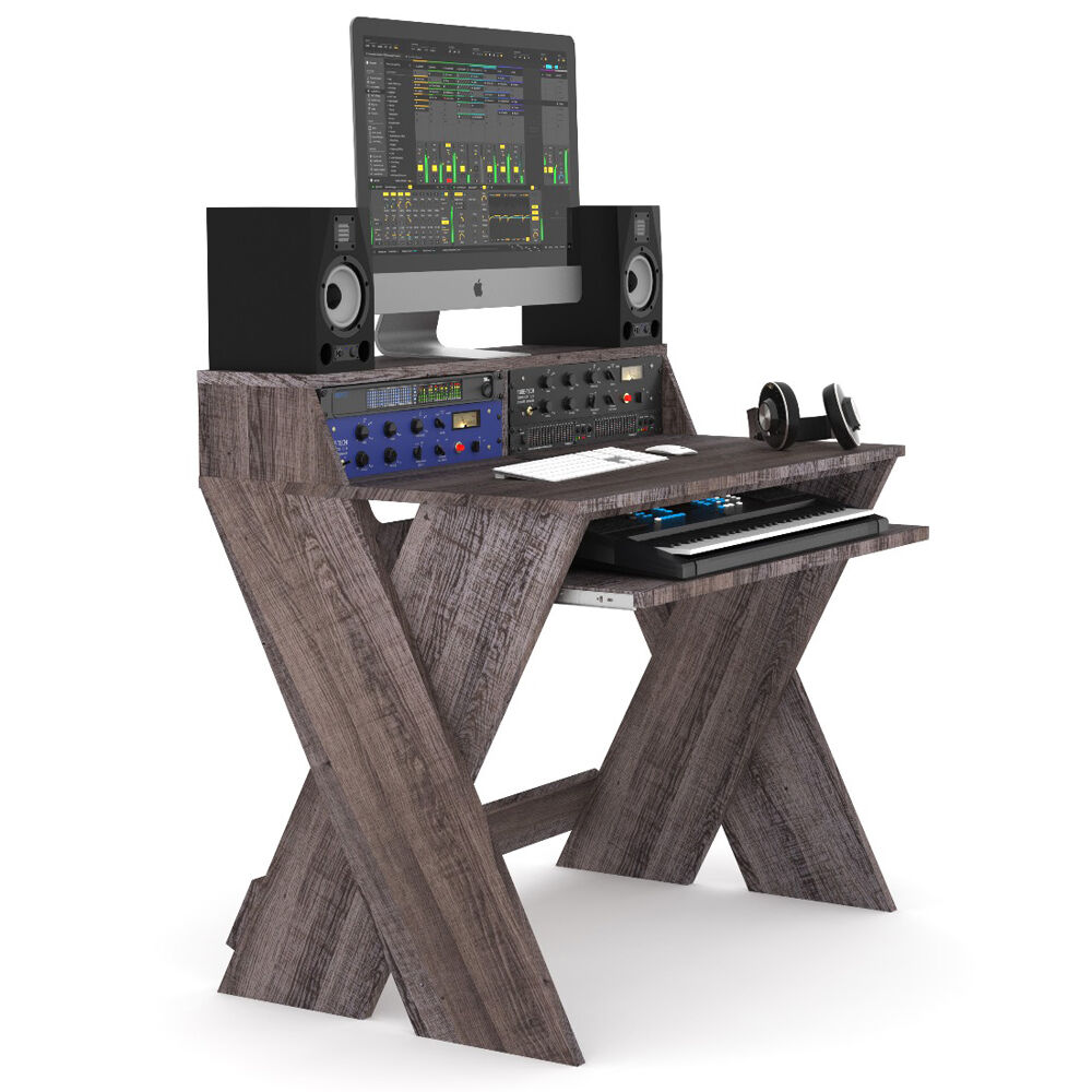 Produce, compose, and work on three levels at the same time with the walnut Sound Desk Compact from Glorious, a versatile, compact studio workstation with a clever design that sports high stability and convenient height adjustment through its X-shaped construction. This studio desk offers enough space to set up laptops and computers, screens, studio monitors, audio interfaces, MIDI gear, and more, with two 3 RU racks that can hold 19" gear, and a slide out tray with six-point adjustment that's wide enough to accommodate a 61-key keyboard, and strong enough to support up to 33 lb.