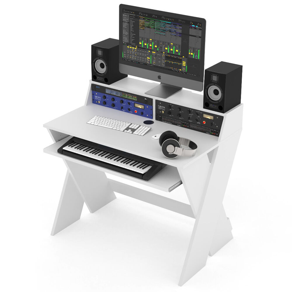 Produce, compose, and work on three levels at the same time with the white Sound Desk Compact from Glorious, a versatile, compact studio workstation with a clever design that sports high stability and convenient height adjustment through its X-shaped construction. This studio desk offers enough space to set up laptops and computers, screens, studio monitors, audio interfaces, MIDI gear, and more, with two 3 RU racks that can hold 19" gear, and a slide out tray with six-point adjustment that's wide enough to accommodate a 61-key keyboard, and strong enough to support up to 33 lb.